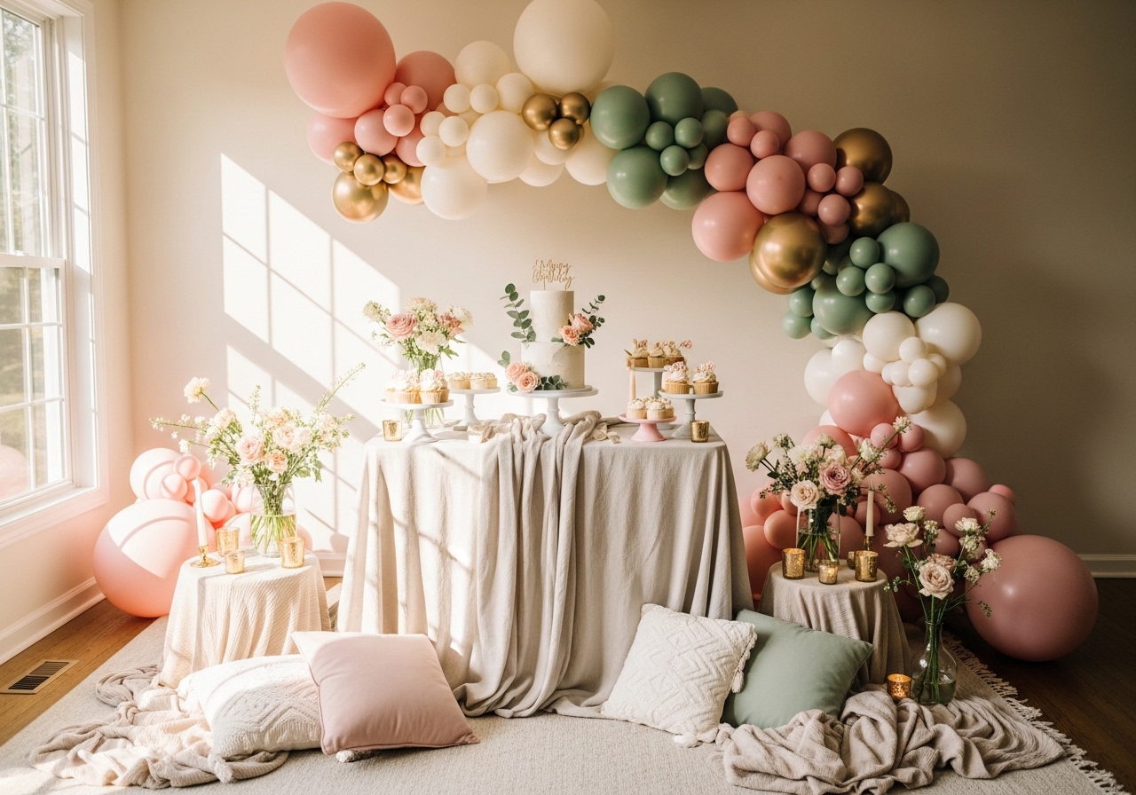 Forget the standard helium balloons tied to chairs; organic balloon garlands are the ultimate way to elevate your birthday decor. The term “organic” in this context means the balloons mimic natural, flowing shapes rather than rigid, structured arches. Achieving this look requires mixing balloons of dramatically different sizes—ranging from tiny five-inch accents to massive three-foot statement balloons. For a highly trendy, Pinterest-approved look, stick to a matte pastel color palette. Shades like sage green, blush pink, dusty blue, and muted mustard work beautifully together to create a soft, sophisticated vibe. You can drape these garlands over entryways, cascade them down a staircase, or use them to frame your dessert table. The beauty of the organic balloon garland lies in its versatility and volume; it acts as a massive installation piece that transforms the architecture of your venue. Adding small sprigs of fresh or faux greenery tucked between the balloons can further enhance the natural, flowing aesthetic of this stunning decoration.